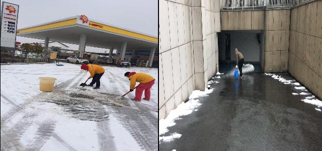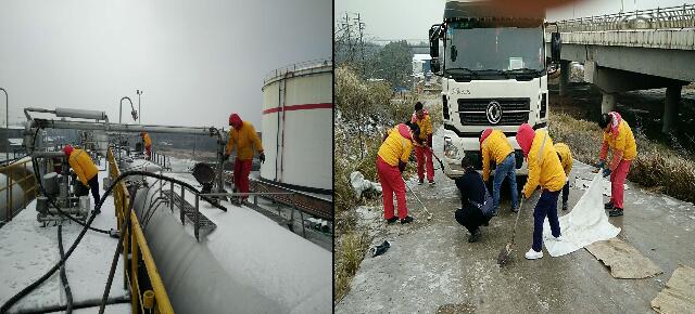寒風(fēng)中,油庫(kù)一線員工為維護(hù)正常卸、發(fā)油而冒雪工作,檢查設(shè)施設(shè)備狀態(tài);物流車隊(duì)司機(jī)們風(fēng)雪無(wú)阻,排除困難,按時(shí)按點(diǎn)將油品安全送達(dá)客戶、送到各站點(diǎn);各個(gè)加油站基層員工通力合作,掃除油站積雪,保障油站進(jìn)出通道順暢通行和行車安全;總部行政、物業(yè)人員也及時(shí)給辦公樓前坪進(jìn)行掃雪、除冰,為行政辦公工作保駕護(hù)航。